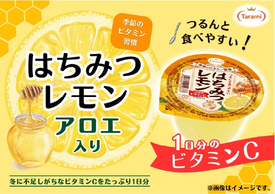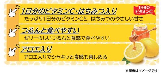 「季節のビタミン習慣 はちみつレモン」は、季節によって不足しがちなビタミンを簡単手軽に取り入れる習慣を後押しする、ビタミン入りの期間限定ゼリーです。ビタミンCを、たっぷり1日分配合。レモンのすっきりした香りとはちみつのまろやかな甘さをプラスして、寒い季節にぴったりのはちみつレモンの味わいに仕上げました。つるんと食べやすいゼリーに、みずみずしいシャキッと食感のアロエ入り。