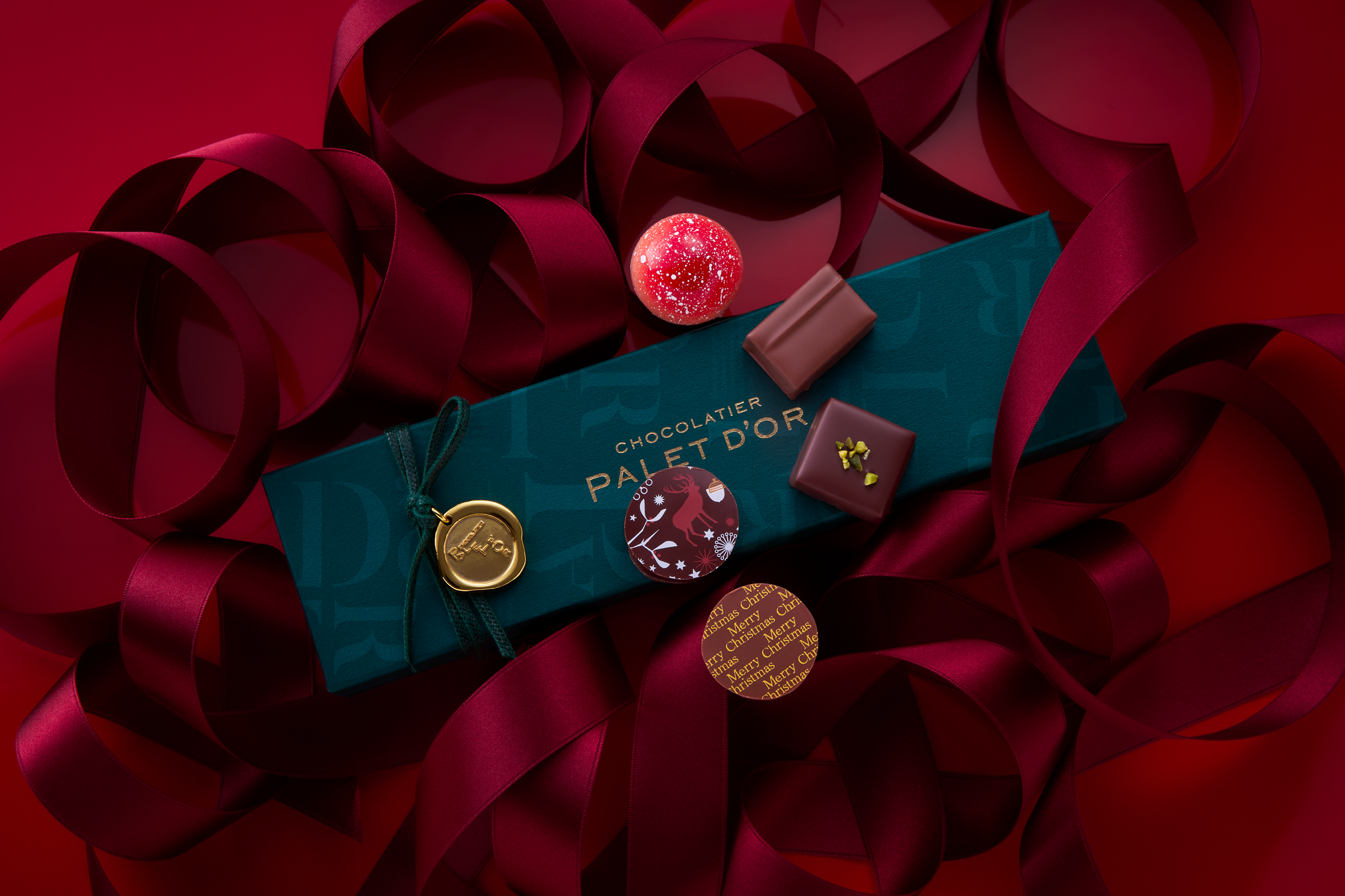 クリスマスギフトにぴったりなコフレノエルも、赤いBOX(ルージュ)と緑のBOX(ヴェール)、選べるふたつの味わいでご用意しました。当店のスペシャリテであるパレドオールをクリスマスデザインでデコレーションし、新作のいちごプラリネをツリーに煌めくオーナメントに見立てた詰め合わせ。