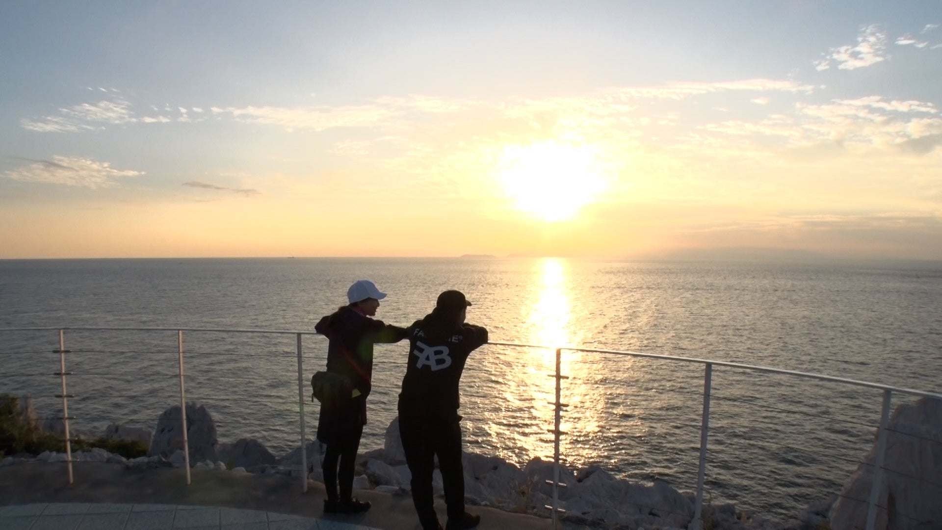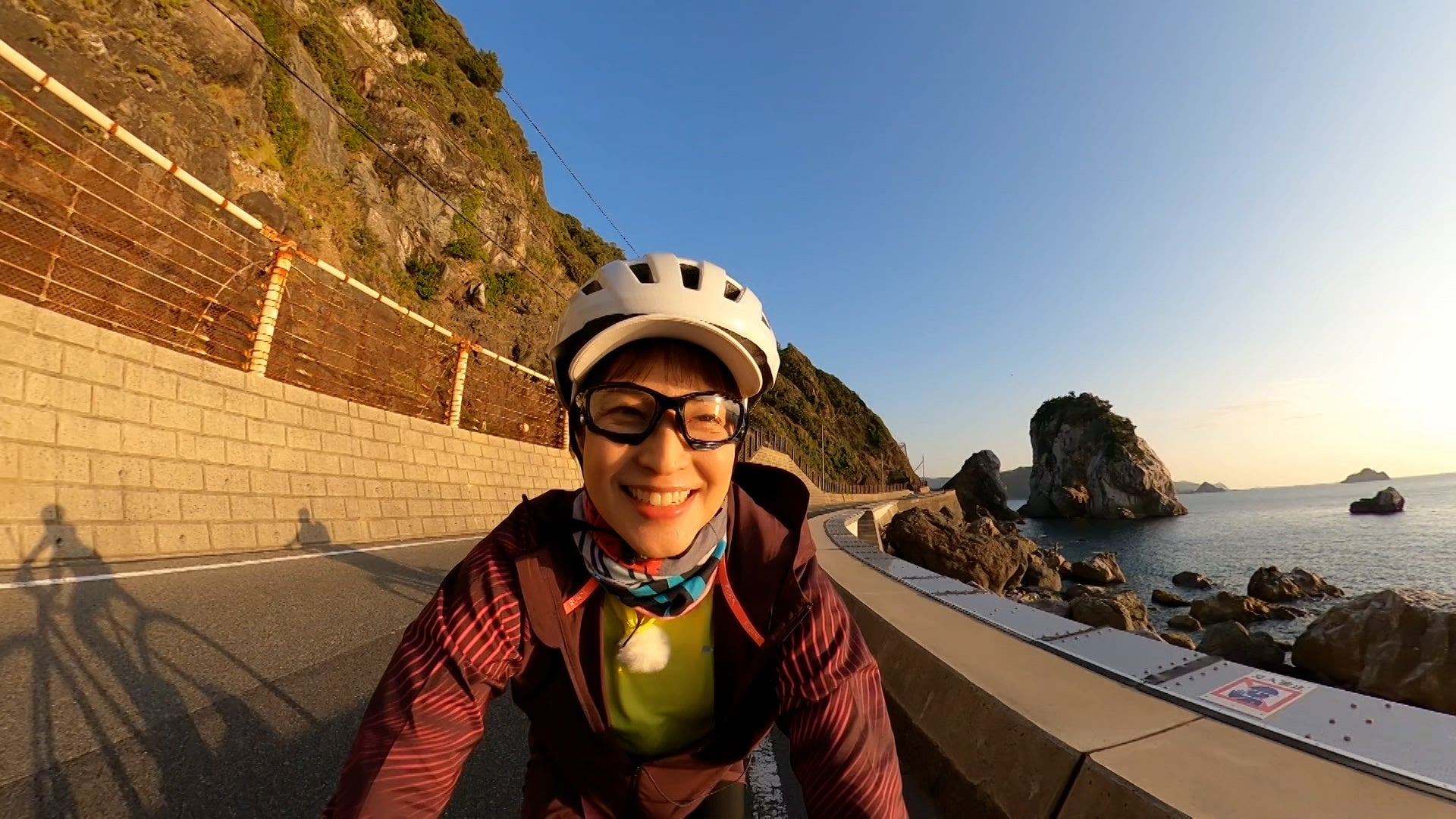 2人は和歌山・紀中のサイクリングマップを作るべく、煙樹ヶ浜からスタートし、ゴールの由良町・白崎海洋公園の夕陽スポットを目指します。