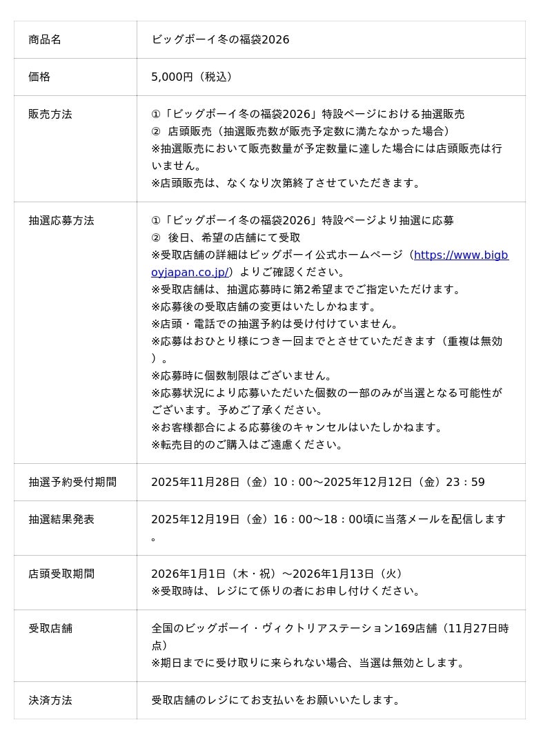 ぜひこの機会に、「ビッグボーイ冬の福袋2026」をお買い求めください。