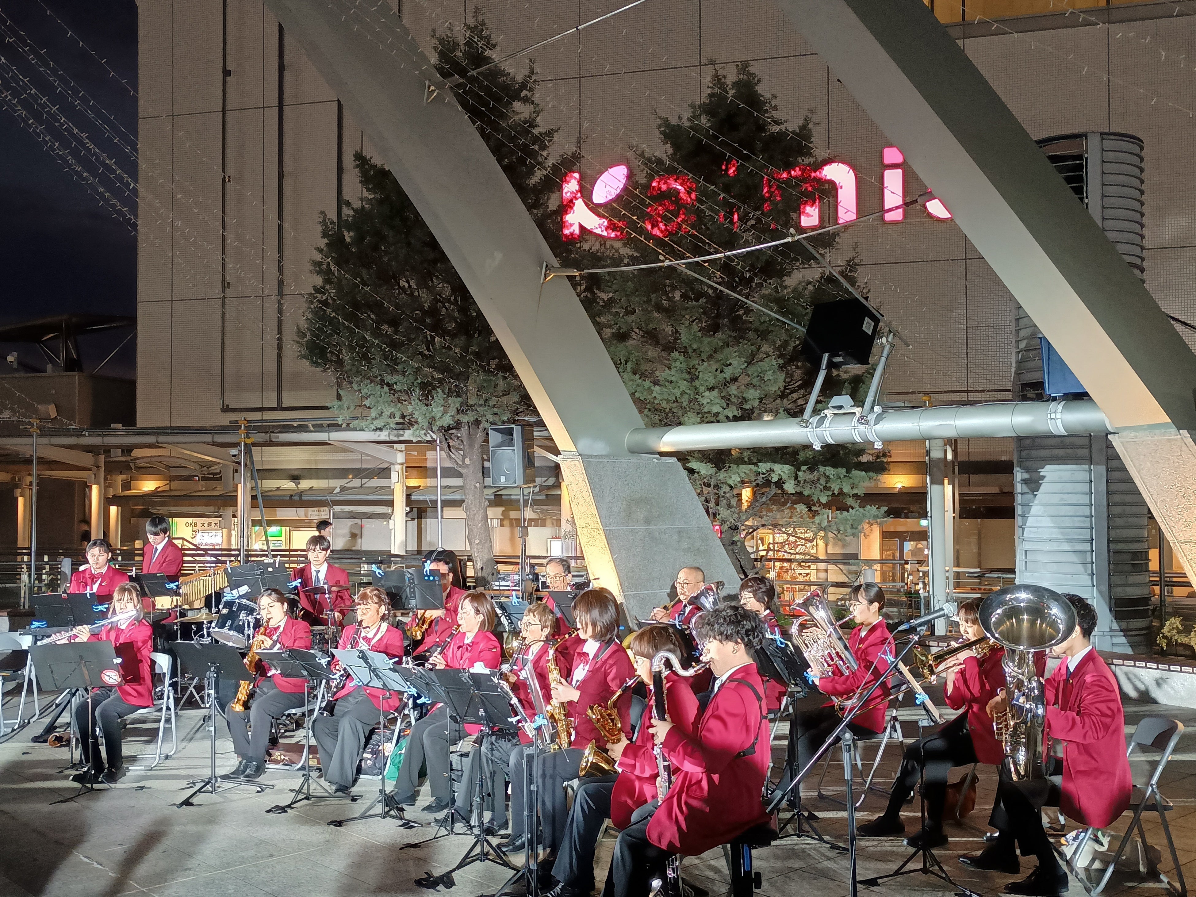 初日の21日(金)午後5時からは、点灯式を東口ペデストリアンデッキで開催しました。吹奏楽団「アンサンブルそれいゆ」がジャズを演奏し、みんなで生演奏を聴きながら、カウントダウンを行いました。