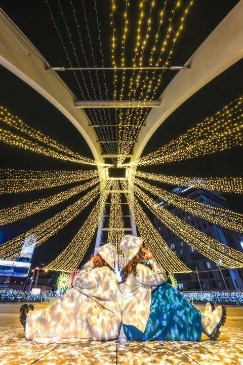 点灯するのは、豊橋駅東口ペデストリアンデッキをはじめ、豊橋市まちなか広場や駅前大通り、広小路通り、駅前の複合商業施設「ココラフロント」。約17万800球の電球が飾られ、午後5時から午前0時まで、まちなかを華やかに灯します。(※会場によって点灯期間・時間が異なります。)