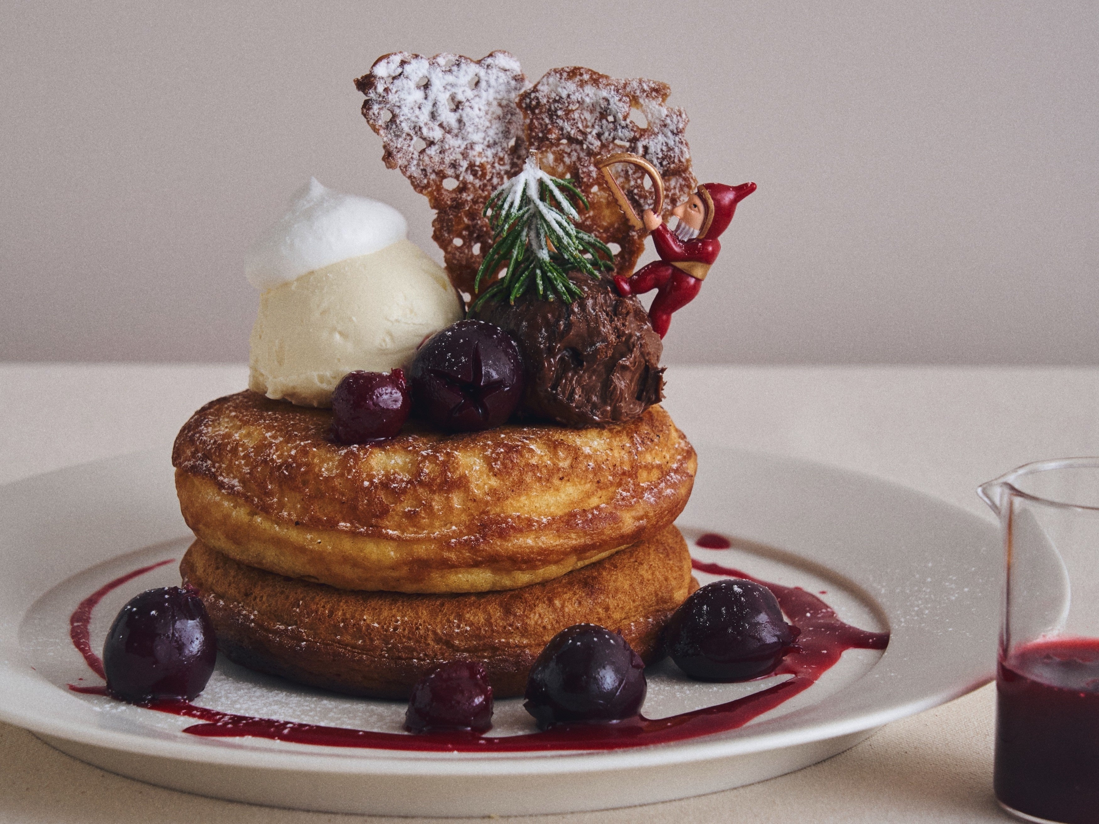 2025年12月1日(月)~12月31日(水)の期間は、<チェリーとショコラムースのフォレノワールパンケーキ グリオットチェリーソース>が登場。濃厚ショコラとチェリーで冬の森をイメージした、この季節だけのひと皿です。
