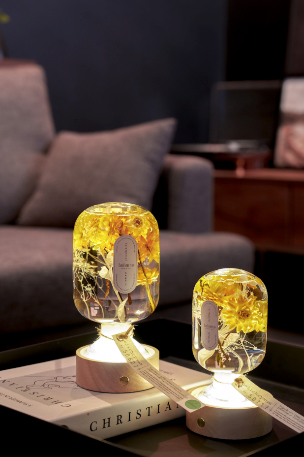 自然の造形を生かした透明感のある作品は、 朝や昼はそのまま置くだけで空間に穏やかな自然の気配をもたらし、夜は底部にLEDライトをセットして灯すと、やわらかな光で植物を包み込み、