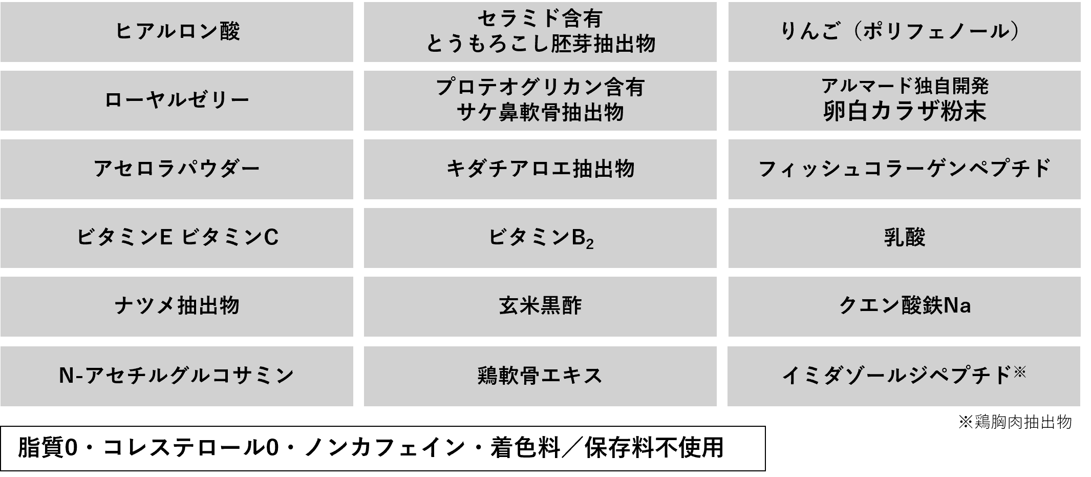 【原材料名】りんご果汁(ニュージーランド製造)、フラクトオリゴ糖、水解卵殻膜粉末、玄米黒酢、鶏胸肉抽出物(アンセリン・カルノシン15%含有)、フィッシュコラーゲンペプチド、卵殻膜粉末、N-アセチルグルコサミン、ナツメ抽出物、キダチアロエ抽出物、鶏軟骨エキス、プロテオグリカン含有サケ鼻軟骨抽出物、卵白カラザ粉末、ローヤルゼリー、アセロラ粉末、トウモロコシ胚芽抽出粉末/トレハロース、乳酸、香料、V.C、安定剤(大豆多糖類)、ユッカ抽出物、ヒアルロン酸、甘味料(スクラロース、ステビア)、クエン酸鉄Na、V. B2、V.E、貝Ca、(一部にえび・かに・卵・さけ・大豆・鶏肉・りんご・ゼラチンを含む)