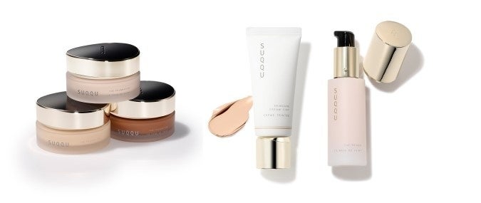 濃密なテクスチャーとなめらかさで端正な満ちる艶へ導く、スックを代表するクリームファンデーション『ザ ファンデーション』(現品価格14,300円)の110番。みずみずしい透明感があふれ、乾燥・紫外線から守る下地要らずのスキンケアファンデーション『スキンケア クリーム ティント』(現品価格8,250円)の10番。光を放ち、ふっくらやわらかなハリ艶を演出し、エイジングサインをカバーする『ザ プライマー』(現品価格11,000円)。