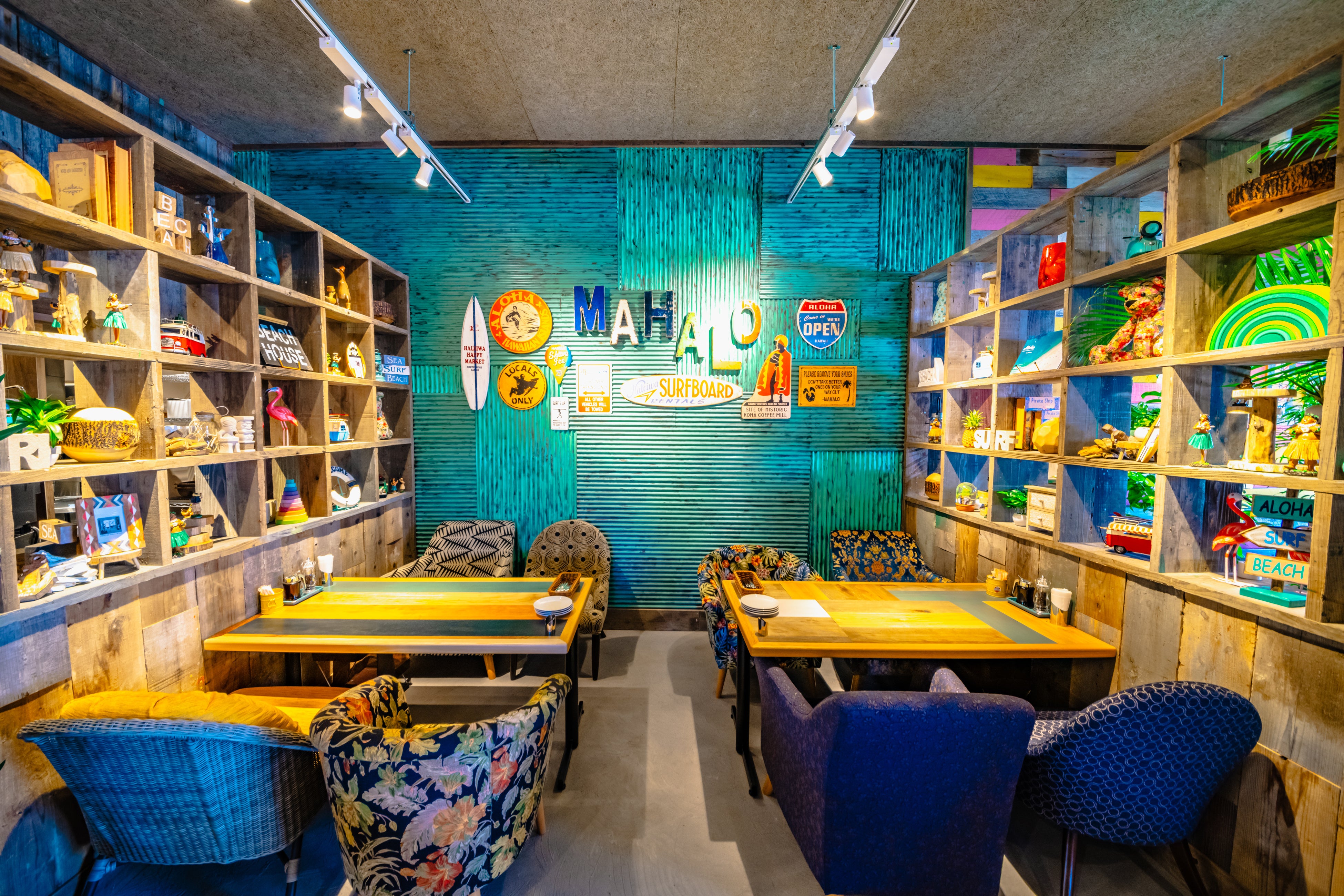 カラフルなハワイアン雑貨やサーフボードが飾られ、遊び心のあるソファやテーブルなどのこだわりのインテリアが、まるで、ハワイのローカルのリビングにいるような雰囲気を演出します。ゆったりとくつろげる空間で、日本にいながらハワイ気分を味わえます。