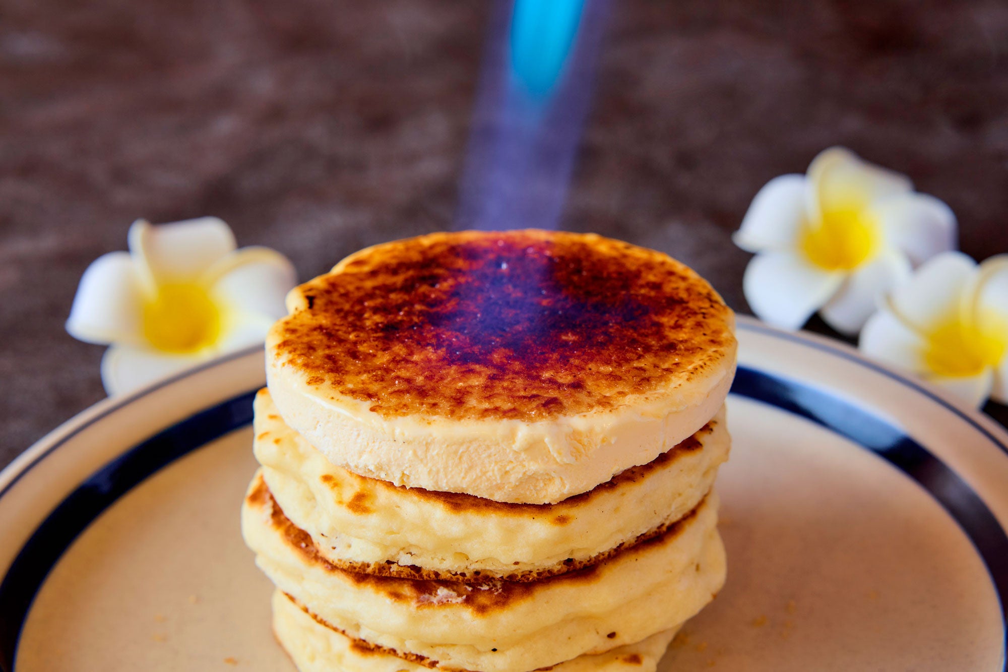 その下に、パンケーキを3枚ボリュームたっぷりに重ねています。ふんわりとした食感と、なめらかなクレームブリュレの一体感をお楽しみください。