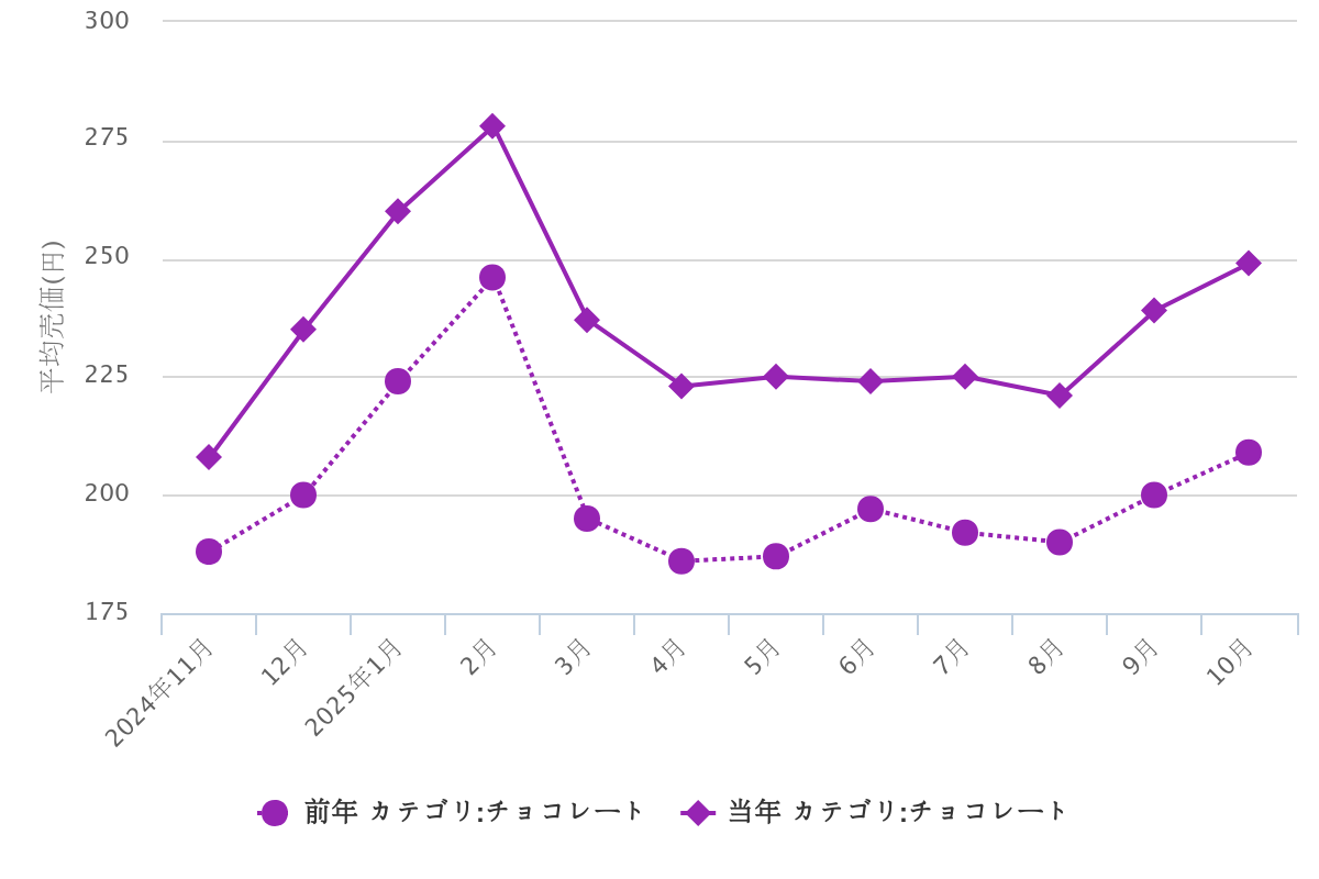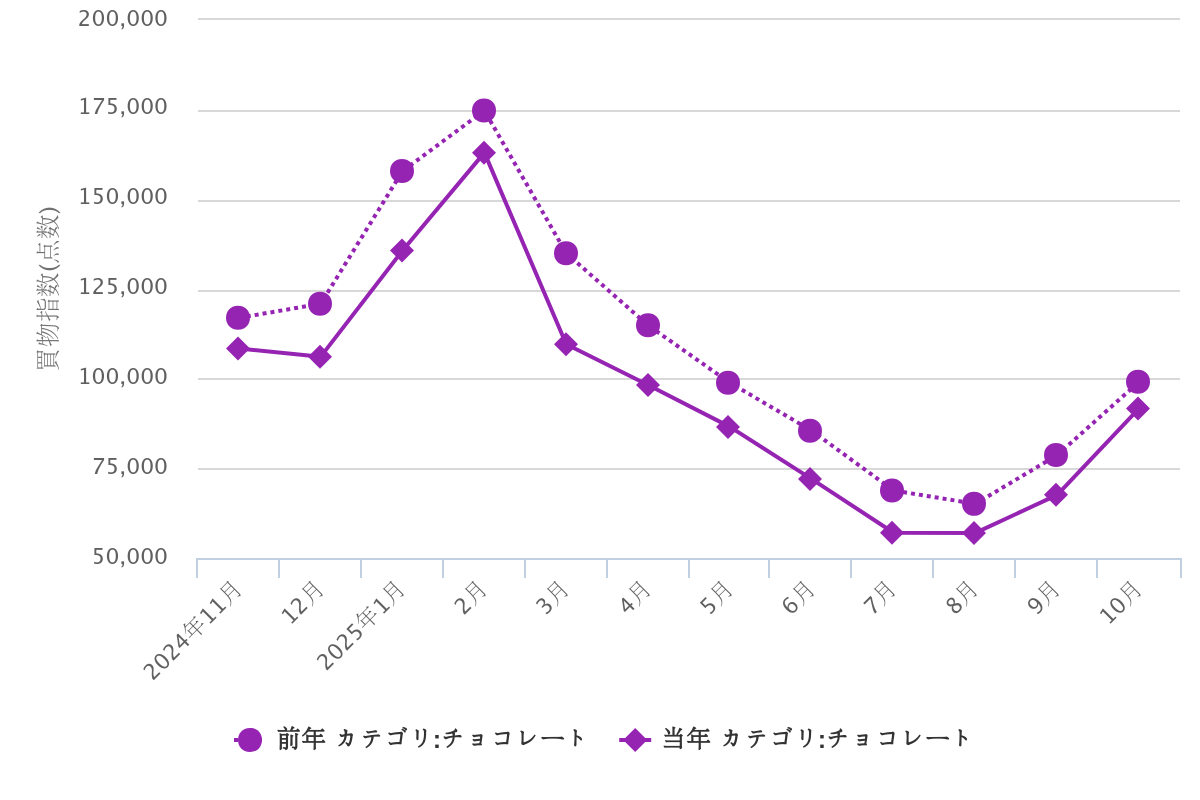 買物指数(点数)とは来店者100万人における売上個数 / データ抽出期間:2023年11月01日~2025年10月31日(実線は本年、点線は前年) / 業態:食品スーパーマーケット / カテゴリ:チョコレート / データ出典:True Data「ドルフィンアイ」