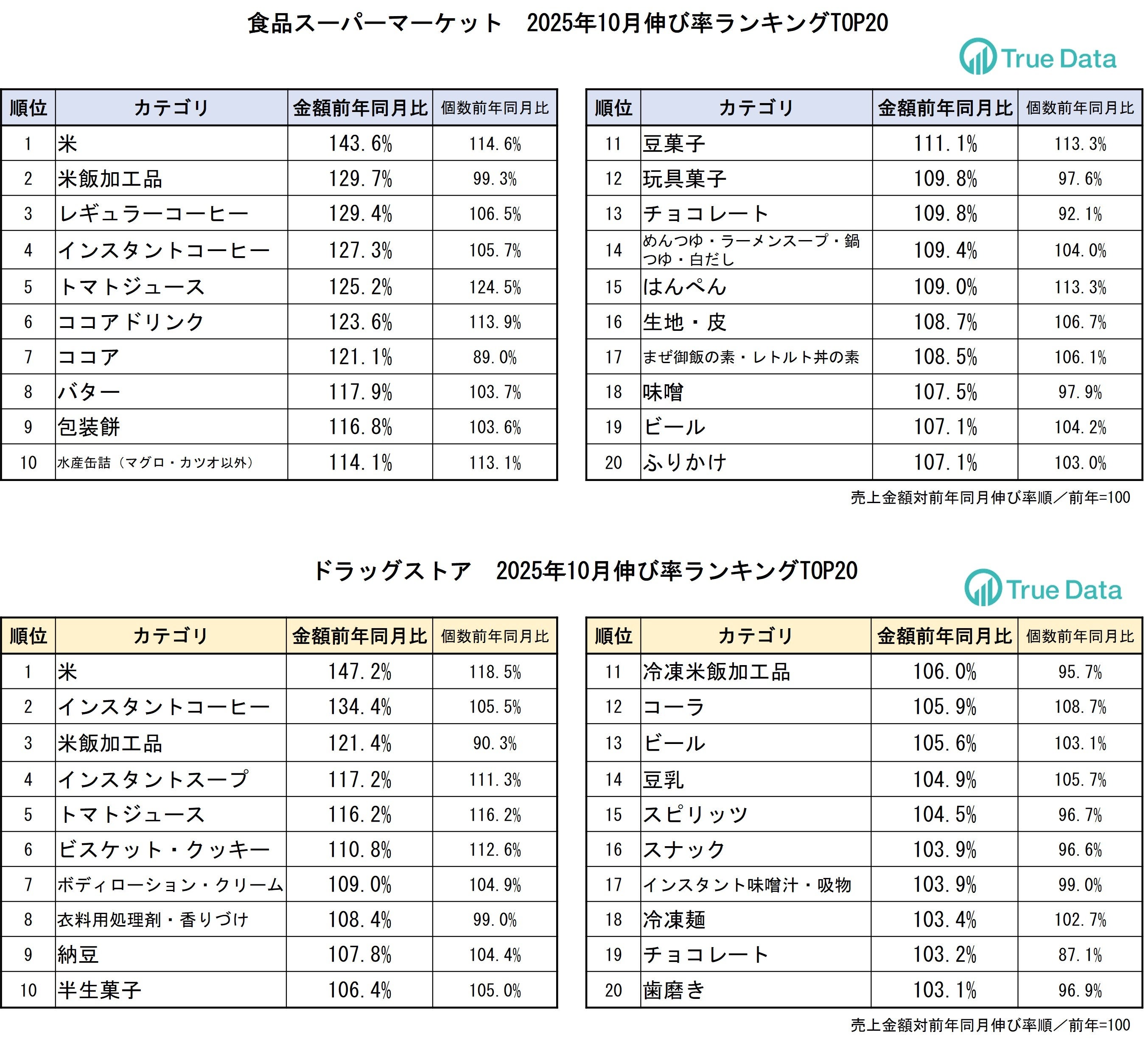 ビッグデータプラットフォームを運営する株式会社True Data(トゥルーデータ/本社:東京都港区、代表取締役社長:米倉 裕之、証券コード4416)は、当社の統計データをもとに、ドラッグストア、食品スーパーマーケットにおける2025年10月の売り上げ伸長カテゴリを発表します。