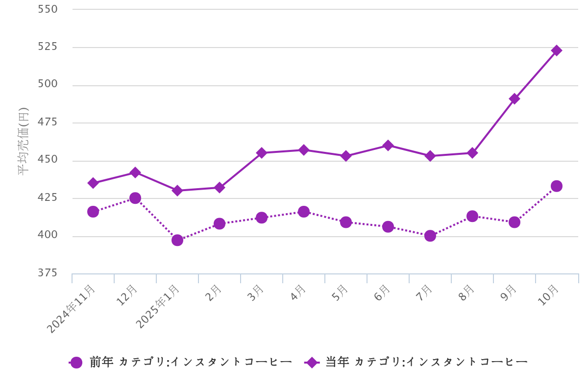 買物指数(点数)とは来店者100万人における売上個数 / データ抽出期間:2023年11月01日~2025年10月31日(実線は本年、点線は前年)/ 業態:食品スーパーマーケット / カテゴリ:インスタントコーヒー / データ出典:True Data「ドルフィンアイ」