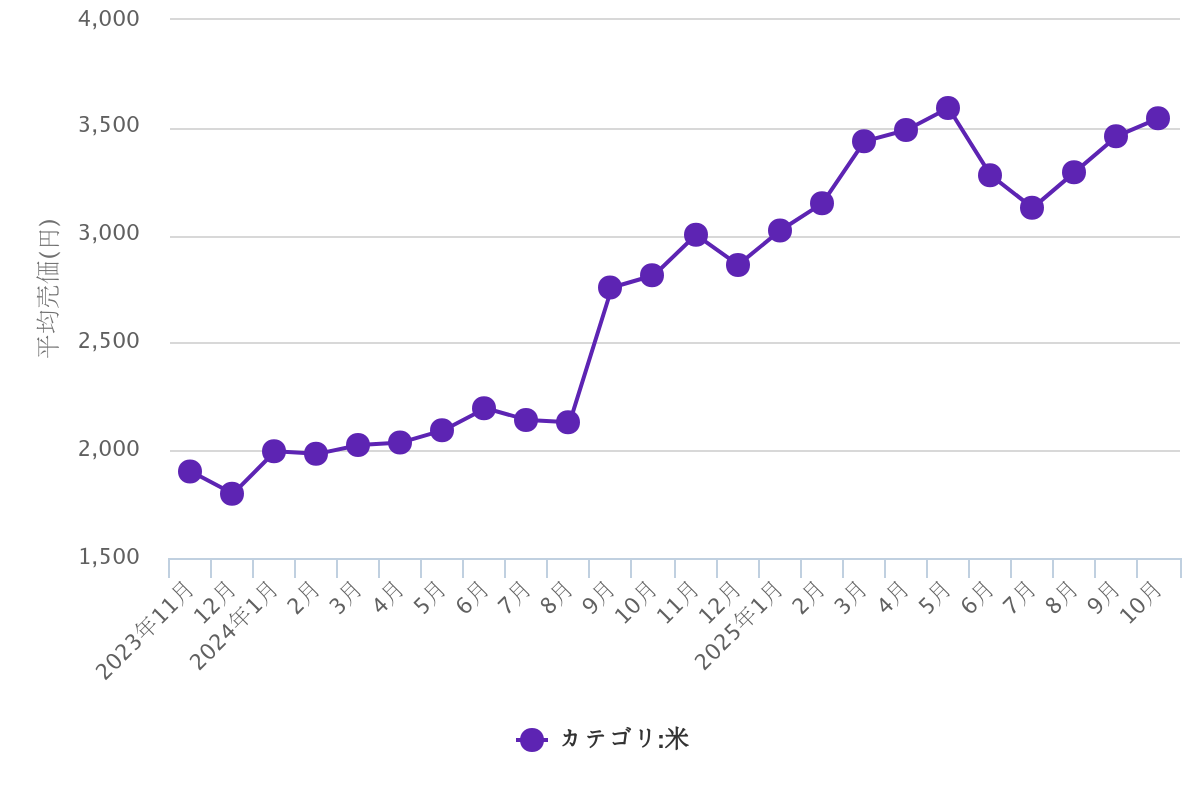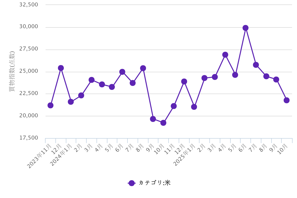 「米」の売り上げが前年同月に比べて大きく伸長しました。食品スーパーマーケットで「米」カテゴリ全体の平均売価は前年同月比で25.9%上昇しています。売上個数は前年10月に大きく減少していた影響で前年同月比が14.6%の増加となり、売上金額は同43.6%増加しました。ドラッグストアでは前年2024年10月はランキング圏外でしたが、当月は1位にランクインしました。
