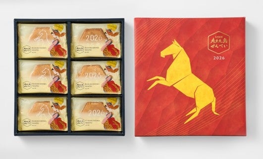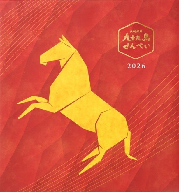 1951年の誕生以来、愛され続けている長崎銘菓『九十九島せんぺい』。縁起物である海亀の甲羅をかたどった六角形をした九十九島せんぺいは、祝い事や時季のご挨拶など大切な節目に長年ご愛顧いただいております。そんな縁起の良い九十九島せんぺいに、さらに2026年の「干支"午"」と「新春」の2種の限定絵柄のりんがけで仕上げた、新しい1年を祝うにふさわしい『九十九島干支せんぺい』をご用意いたしました。大切な商品を包むパッケージにも、"午"をモチーフにしたこの時期限定のデザインを施し、新年を迎える特別感を演出いたします。