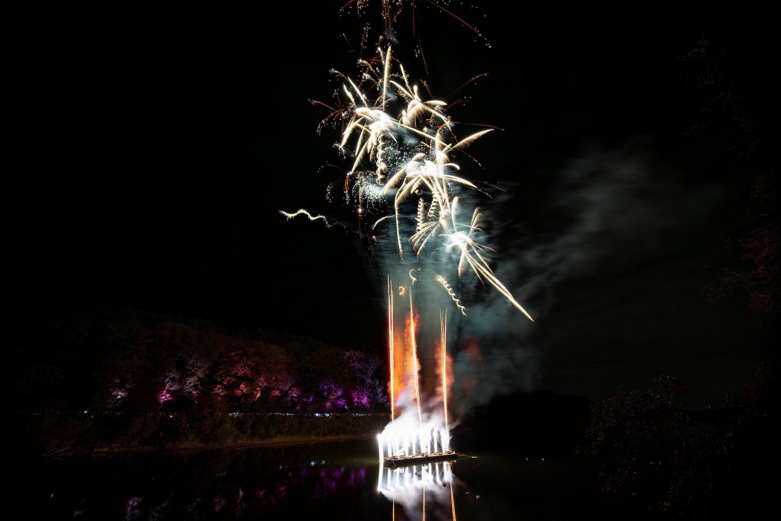 ムーミンバレーパークのオリジナルソングに合わせて、湖の上から打ちあがる花火は冬の夜空を色鮮やかに染め上げます。