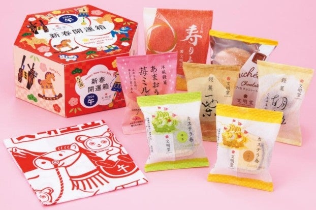 2026年の干支「午」をデザインした箱に、文明堂の人気商品と干支ふきんを詰め合わせました。(実店舗)