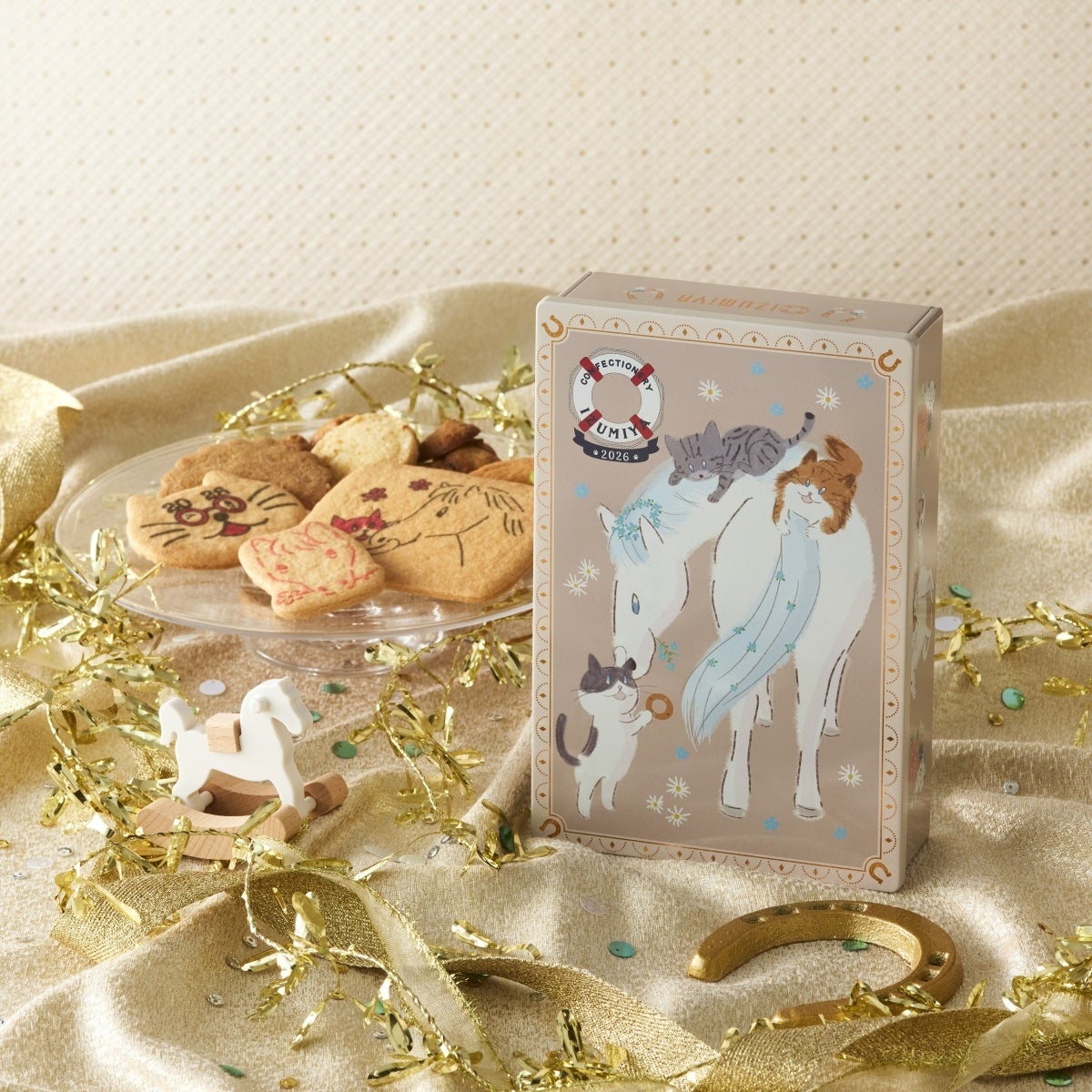 2026年の干支である「うま」に乗った泉屋東京店の「ねこ」達を描いたアート缶。プリントクッキーをはじめとしたアソートギフトです。(実店舗・オンライン)