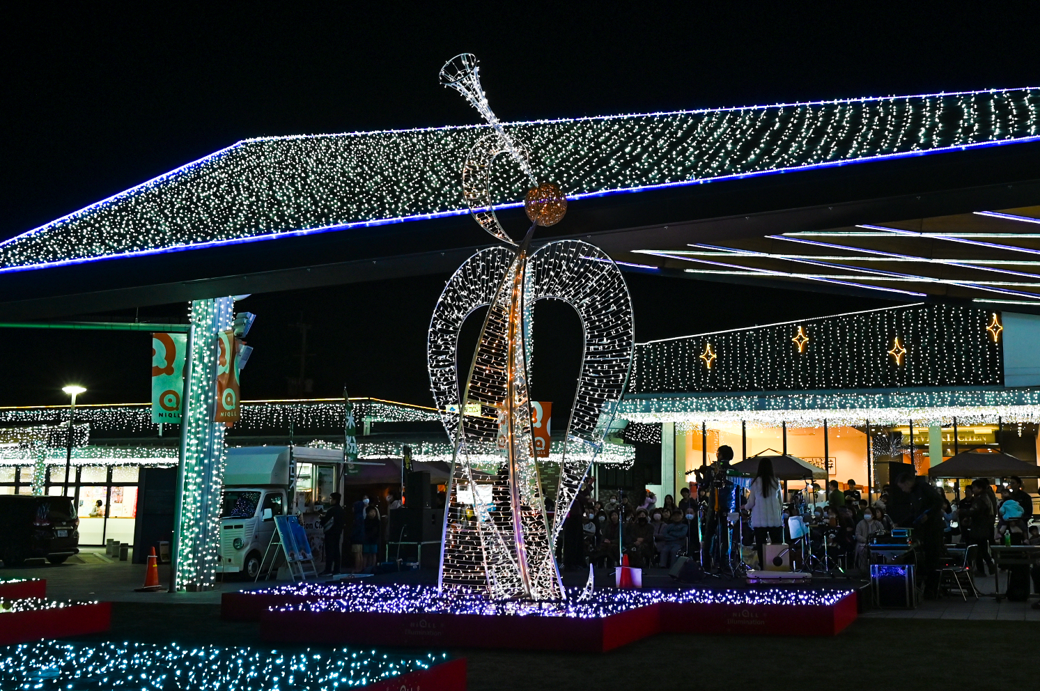 芝生広場には、シンボルとなる大型のオブジェを設置したほか、イルミネーションを一面に張り巡らし幻想的な空間を演出しています。また、特徴的なデザインのイベント広場天井や屋根は、その魅力を引き立てるよう線と面で色とりどりに装飾されていて、国道側の"NiQLL"ロードサインはNiQLLカラーで彩りました。