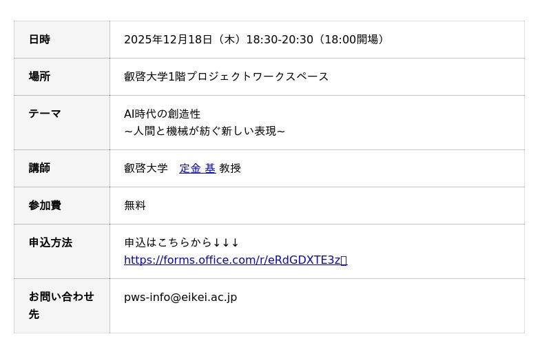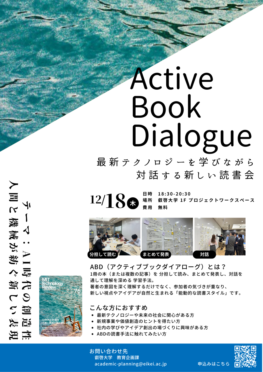 叡啓大学(学長:有信睦弘、広島市中区)は、2025年12月18日(木)、叡啓大学プロジェクトワークスペースにて、 最新テクノロジーを学びながら対話する読書会「ABD(アクティブブックダイアローグ)by Eikei Project Work Space」を開催します。