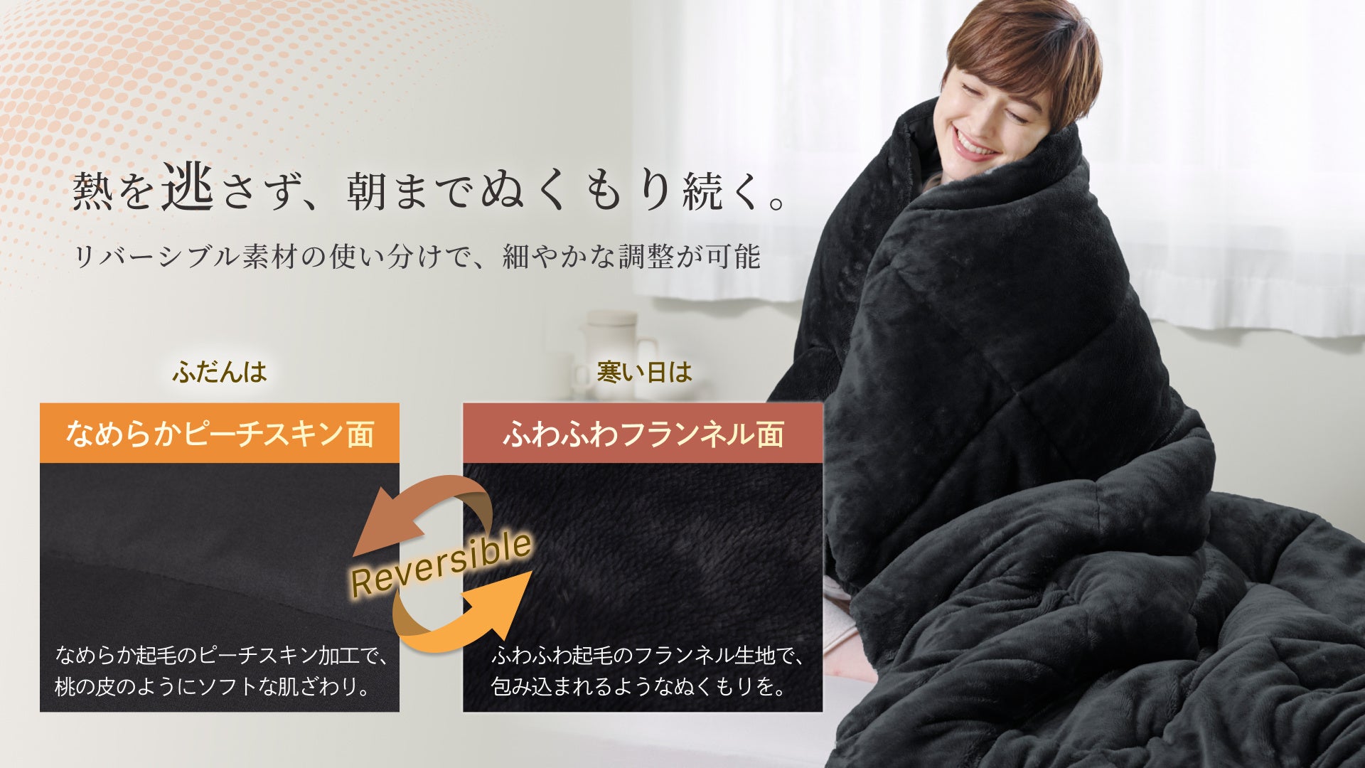 なめらかなピーチスキン面と、ふわふわのフランネル面を備えたリバーシブル仕様です。吸湿発熱わたとダウンライクわたが、湿気を熱に変えてあたたかさをキープ。軽く空気をたっぷり含むため、体にふんわり寄り添いながらもしっかり保温。寒い夜も朝までぬくもりを逃さず、心地よい眠りを支えます。
