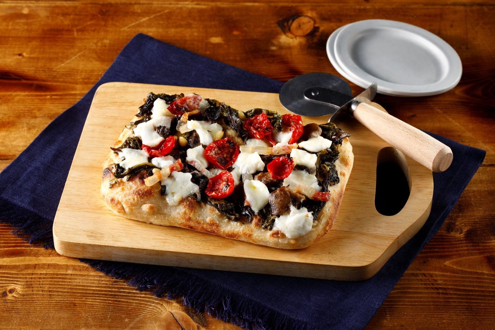 スーパーフード「スペルト小麦」を使った香り高い生地に、黒マイタケの旨味、イタリアの葉物野菜・スカローラのほろ苦さ、パンチェッタの塩味を重ねた、サルバトーレ クオモ渾身のスペシャルピッツァ。