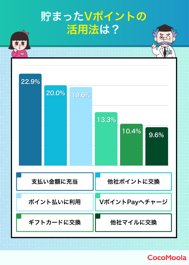 - 三井住友カードの利用で貯まったVポイントの最も定番な活用法は、全体の約23%が挙げた「支払い金額に充当(キャッシュバック)」。一方で、貯まったVポイントを「特に活用していない」層も20%ほど存在する。