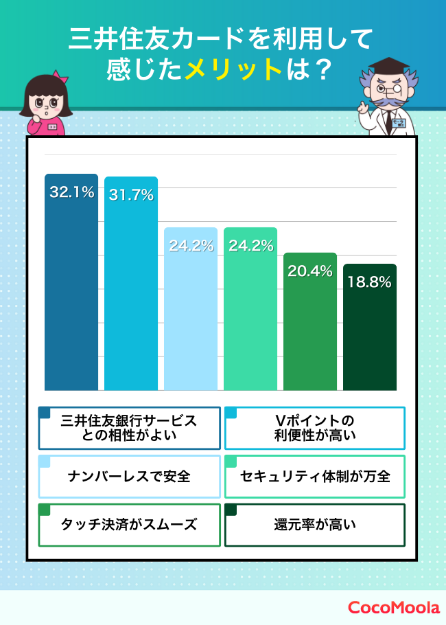 - 三井住友カードを選んだ理由TOP3は「年会費が安いから」「三井住友銀行を以前から利用していたから」「ポイント還元率がアップする店舗・サービスが多いから」。
