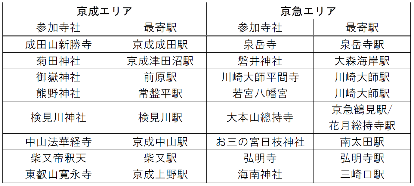 京成電鉄株式会社(本社:千葉県市川市、社長:天野 貴夫、以下 京成電鉄)および京浜急行電鉄株式会社(本社:横浜市西区、社長:川俣 幸宏、以下 京急電鉄)では、両社が締結した共同検討に関する合意書に基づく「両社沿線の観光拠点等への相互送客施策」の第1弾として2025年12月1日(月)から2026年3月1日(日)まで「京成×京急 16寺社御朱印めぐり」を実施いたします。