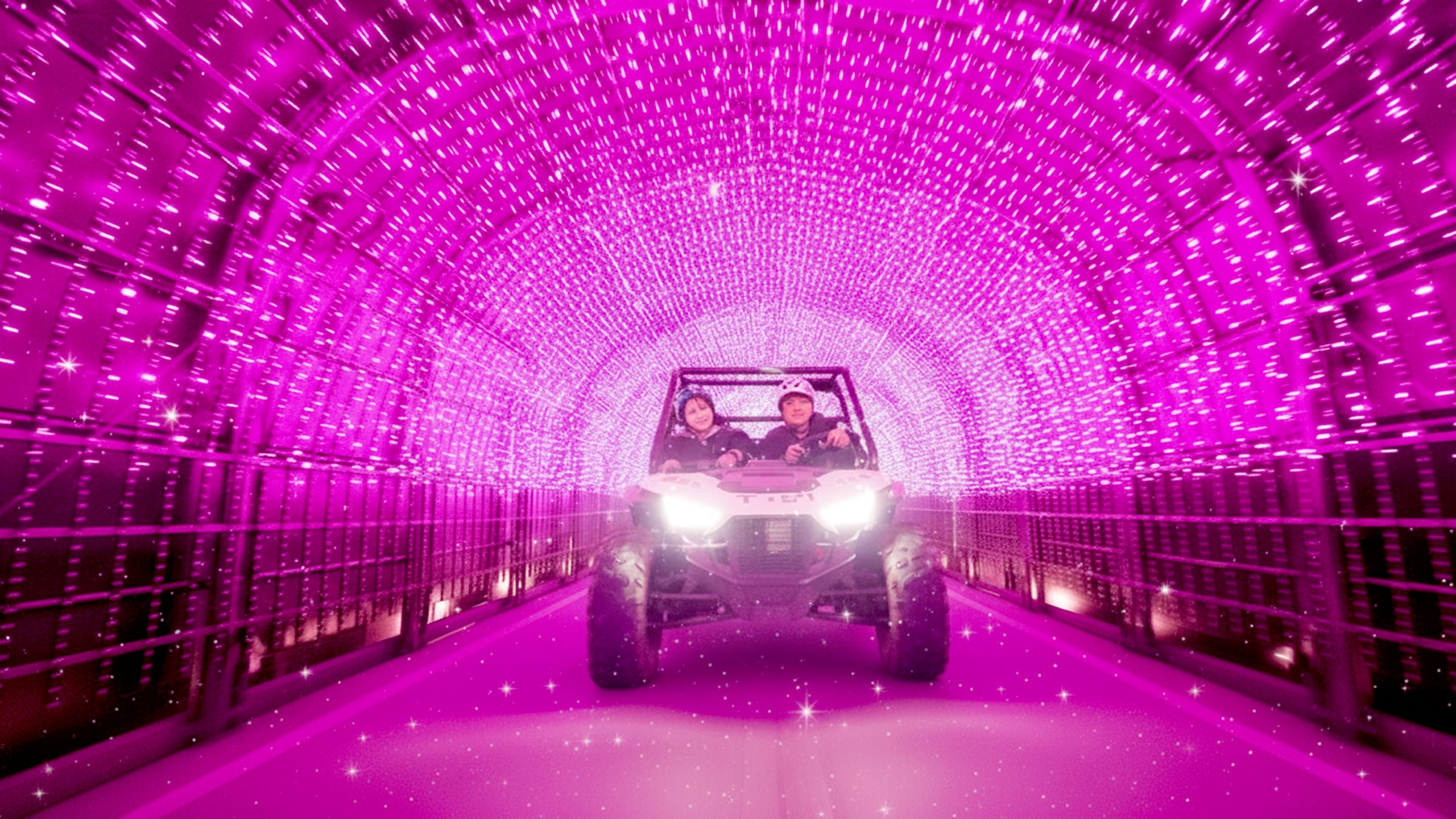 ホテルを出発すると、まず目の前に現れる光の演出エリア。色とりどりの輝きがトンネル状に連なる幻想的な空間を抜けます。冬の澄んだ空気の中、光や星空に包まれながらバギーで駆け抜ける非日常の冒険。光と自然が織りなす体験を、大切な人とご一緒にお楽しみください。