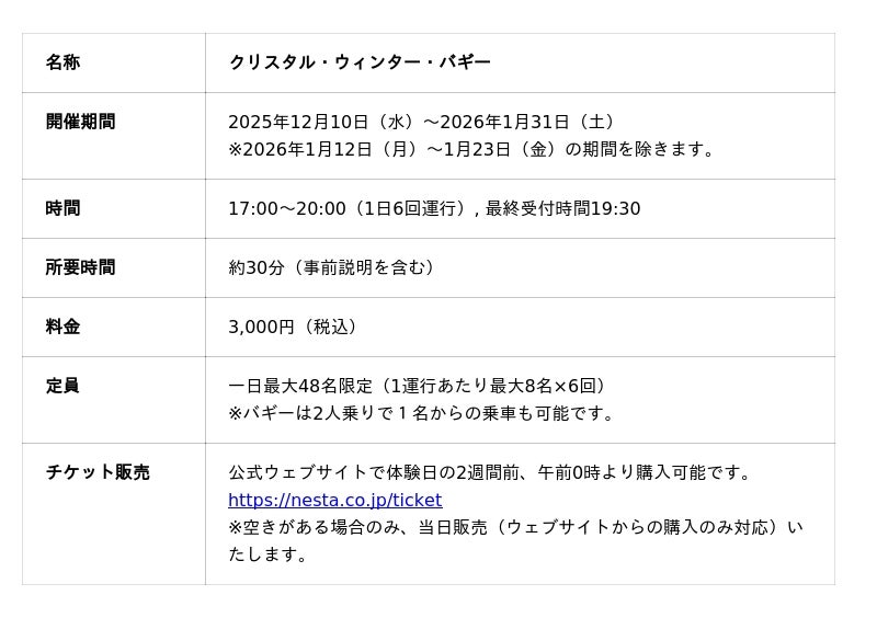 株式会社ネスタリゾート神戸(所在地:兵庫県三木市、代表取締役社長:田中淳)は、2025年12月10日(水)から2026年1月31日(土)の期間※1、大自然の冒険テーマパーク「ネスタリゾート神戸」で冬季限定の特別イベント「ナイトバギー『クリスタル・ウィンター・バギー』」を開催いたします。