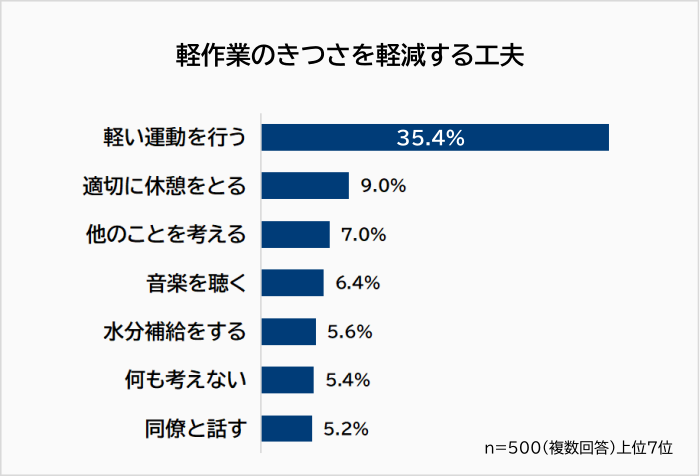 「軽作業のきつさを軽減する工夫」を聞いたところ、圧倒的1位は「軽い運動を行う(35.4%)」です。2位は「適切に休憩をとる(9.0%)」となりました。
