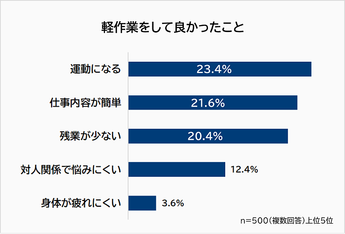 「軽作業をして良かったこと」を聞いたところ、1位は「運動になる(23.4%)」でした。2位「仕事内容が簡単(21.6%)」、3位「残業が少ない(20.4%)」と答えた人も多くなっています。