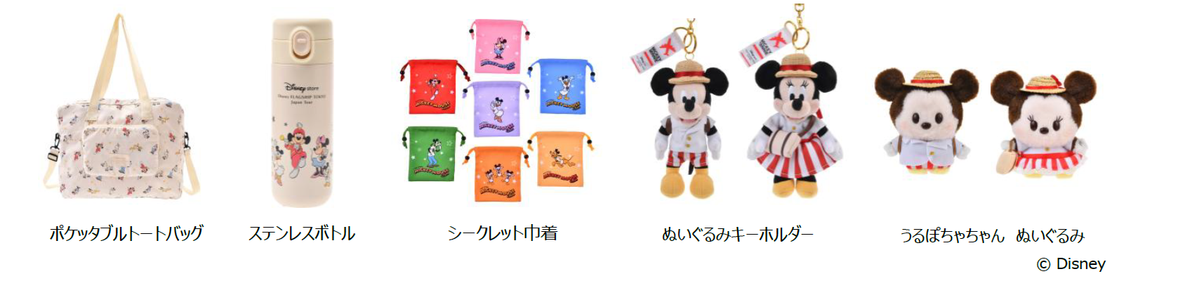 会場限定アイテムに、『ミッキーマウス・クラブ』のアートを使用したアイテムなども加わり、新たに12種類を展開します。旅行に便利なポケッタブルトートバッグやステンレスボトル、キーホルダー、全7種のシークレット巾着など、日常使いにも嬉しい雑貨が充実します。また、ご好評をいただいている、"旅"をテーマにお揃いの帽子を身につけたミッキーマウスとミニーマウスのぬいぐるみキーホルダーや「うるぽちゃちゃん」のぬいぐるみは、赤いストライプの新コスチュームをまとって登場します。