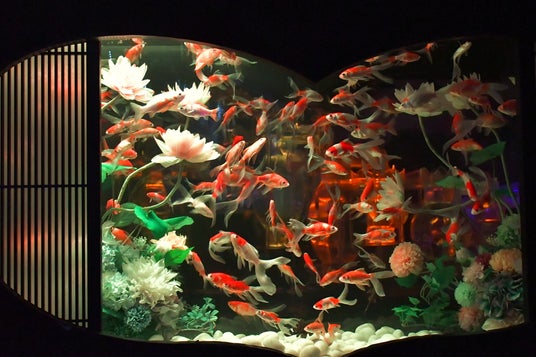 花の名を冠したアートアクアリウムの代表的水槽作品「花魁」に文字通りの大輪の花が咲き、金魚と水槽作品の華やかさを引き立てます。
