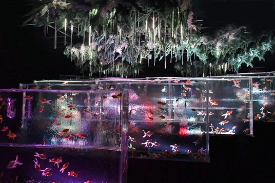 金魚泳ぐ水槽作品が"移ろいの季節"を表現します。