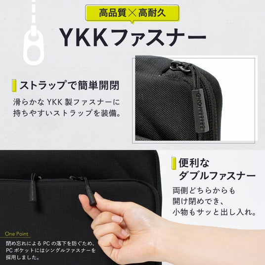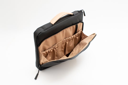 また、PCポケットは横からサッと出し入れできるサイド開き構造で、バッグに入れたままPCだけを取り出すことも可能。ビジネスシーンでもスムーズに使える設計です。