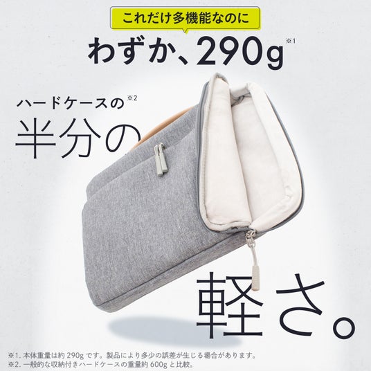 厚手クッションによるやさしい保護、起毛素材の内装、片手で持てる2WAYハンドル、軽量290gの扱いやすさなど、日々の持ち運びに"安心"と"心地よさ"をプラスする新モデルです。