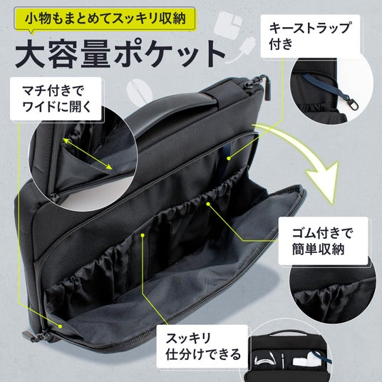 マチ付きで大きく開くフロントポケットは、マウス・充電器・ケーブル・モバイルバッテリーなどの小物収納に便利。キーストラップやゴムバンドを備え、細かいアイテムもすっきり整理できます。