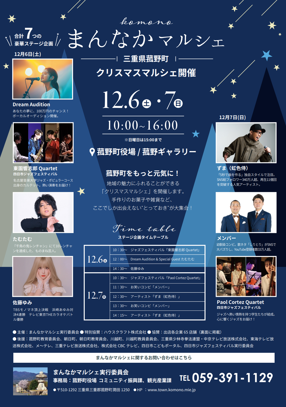 2025年12月6日(土)、7日(日)に菰野町役場周辺で「まんなかマルシェ」が開催されます。ステージイベントや雑貨、キッチンカーの出店など、地域の魅力を楽しめる内容です。