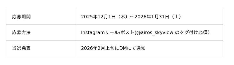 あわせて、2025年12月1日(月)~2026年1月31日(土)の期間で、これまでAirXのフライトをご予約いただいた方を対象に、Instagram投稿キャンペーンを実施いたします。期間中にご投稿いただいた方の中から、抽選で1名様に、東京ヘリポート発10分デイフライトをプレゼントいたします。