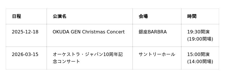 奥田弦は下記のスケジュールにて公演を予定しております。詳細は奥田弦公式サイトにてご確認ください。