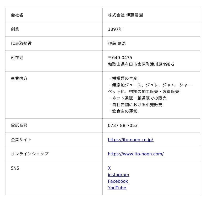 伊藤農園は、みかんの名産地・和歌山県有田市で明治30年(1897年)に創業した、柑橘の生産から加工・販売までを行う"6次産業"の農園です。温暖な気候と潮風に育まれた有田みかんを中心に、地元農家の方々と協力しながら、歴史あるみかん畑を守り続けています。