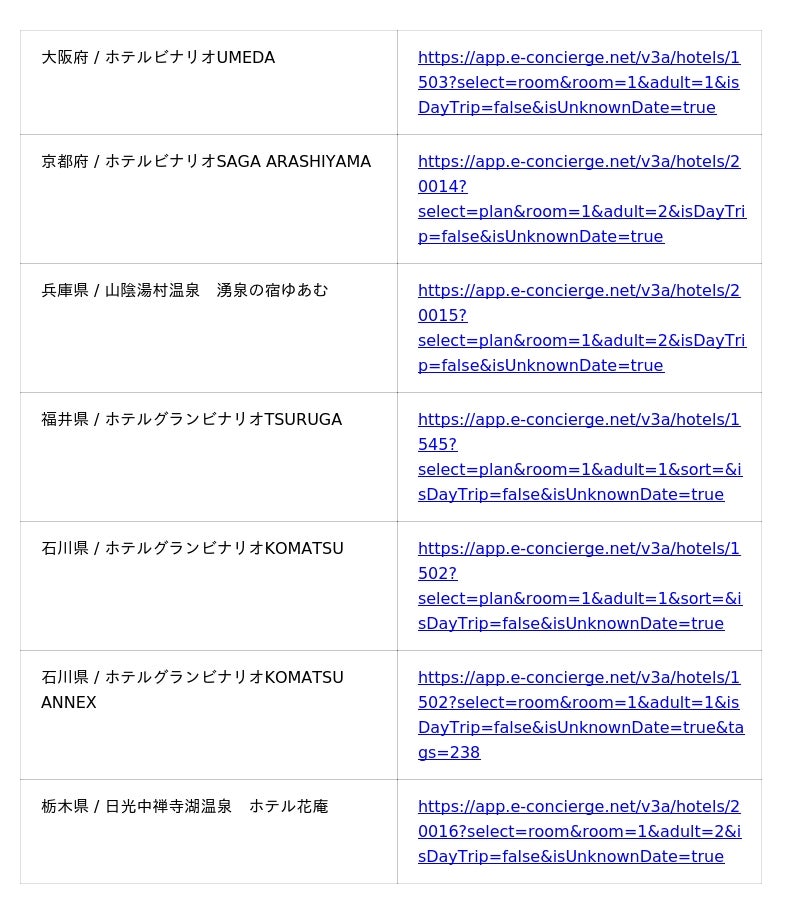 各ホテルの予約URL一覧