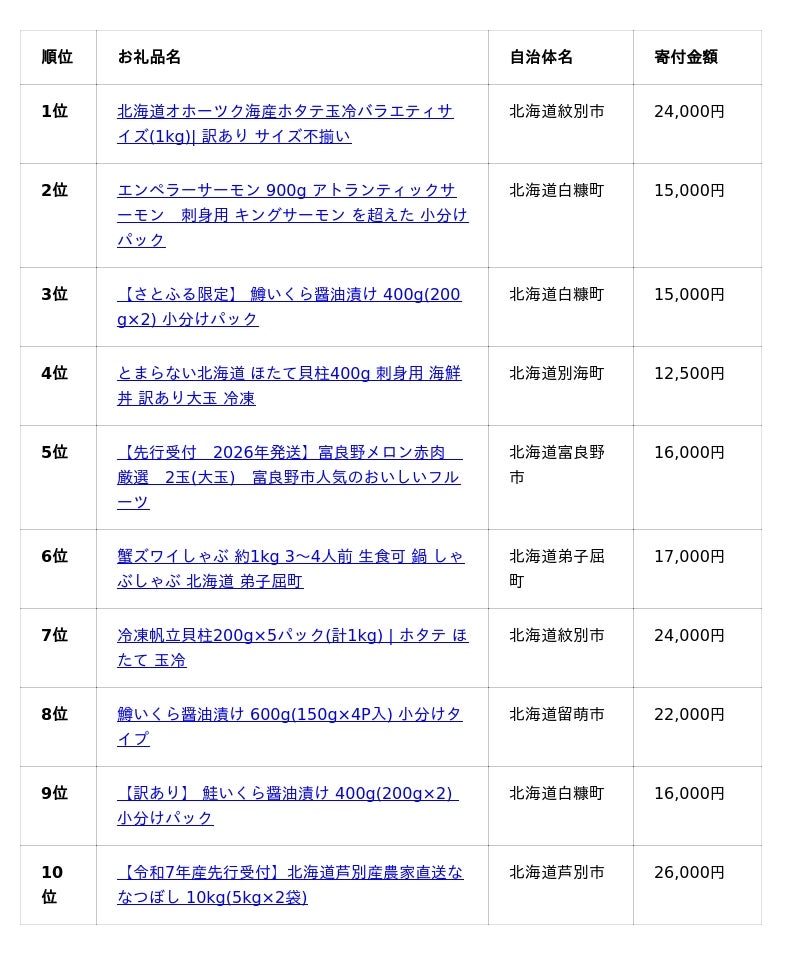 <北海道版>2025年ふるさと納税人気お礼品ランキング(速報)詳細は以下よりご確認ください。