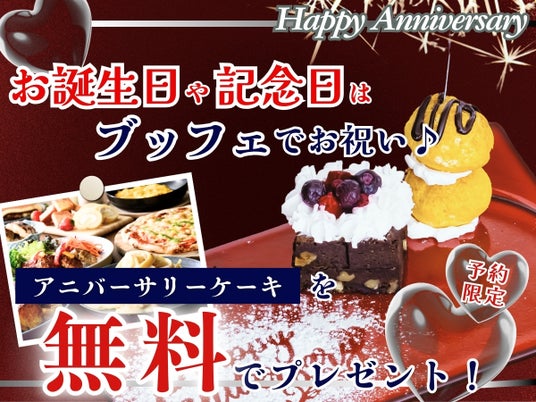 【ニラックスブッフェで特別なひと時を🎂】バラエティー豊かな食べ放題でお祝いをしよう!2日前までのご予約限定にて『無料』でアニバーサリーケーキをご提供いたします。
