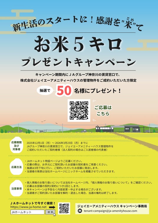 神奈川県を中心に約2万2,000戸の賃貸アパート・マンションの管理および、JAパーキングネットの運営を手がけ、入居率98.5%(※2025年10月末現在)を維持する株式会社ジェイエーアメニティーハウス(本社:神奈川県平塚市、代表取締役社長:小野 忠久)は、2020年から実施している「国産農畜産物応援プロジェクト」の一環として、『新生活のスタートに!感謝を"米"て お米5kgプレゼント!キャンペーン』 を今年度も実施いたします。