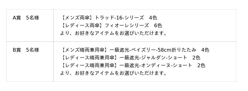 B賞:「メンズ晴雨兼用傘折りたたみ傘」または「レディース晴雨兼用傘ショート傘」