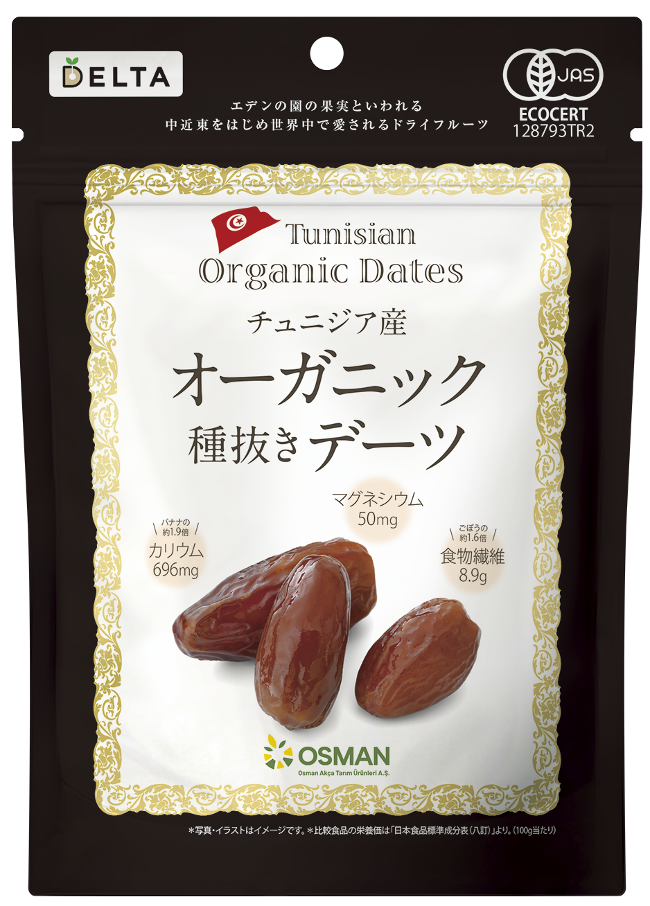 ナッツとドライフルーツの専門商社、株式会社デルタインターナショナル(本社:東京都品川区、代表取締役社長:鳥海 敬)は、2025年12月1日、新商品『チュニジア産オーガニック種抜きデーツ(160g)』を発売いたします。