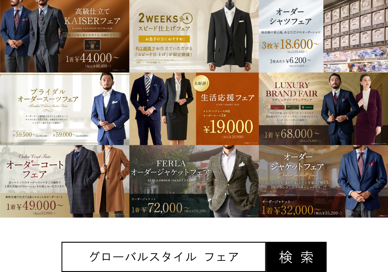 オーダースーツ専門店「グローバルスタイル」を運営するグローバルスタイル株式会社(東京証券取引所 スタンダード市場:7126、本社:大阪市中央区、代表取締役社長 田城弘志)は、 対象プランのご利用で『本格オーダースーツ2,000円OFFクーポン』をプレゼントするフェアを開催いたします。クーポンのご利用で本格オーダースーツが1着あたり23,000円~(税込25,300円~)ご購入いただけます。《年内最後》のフェアは12月1日(月)から12月31日(水)までの期間限定、全店舗対象です。