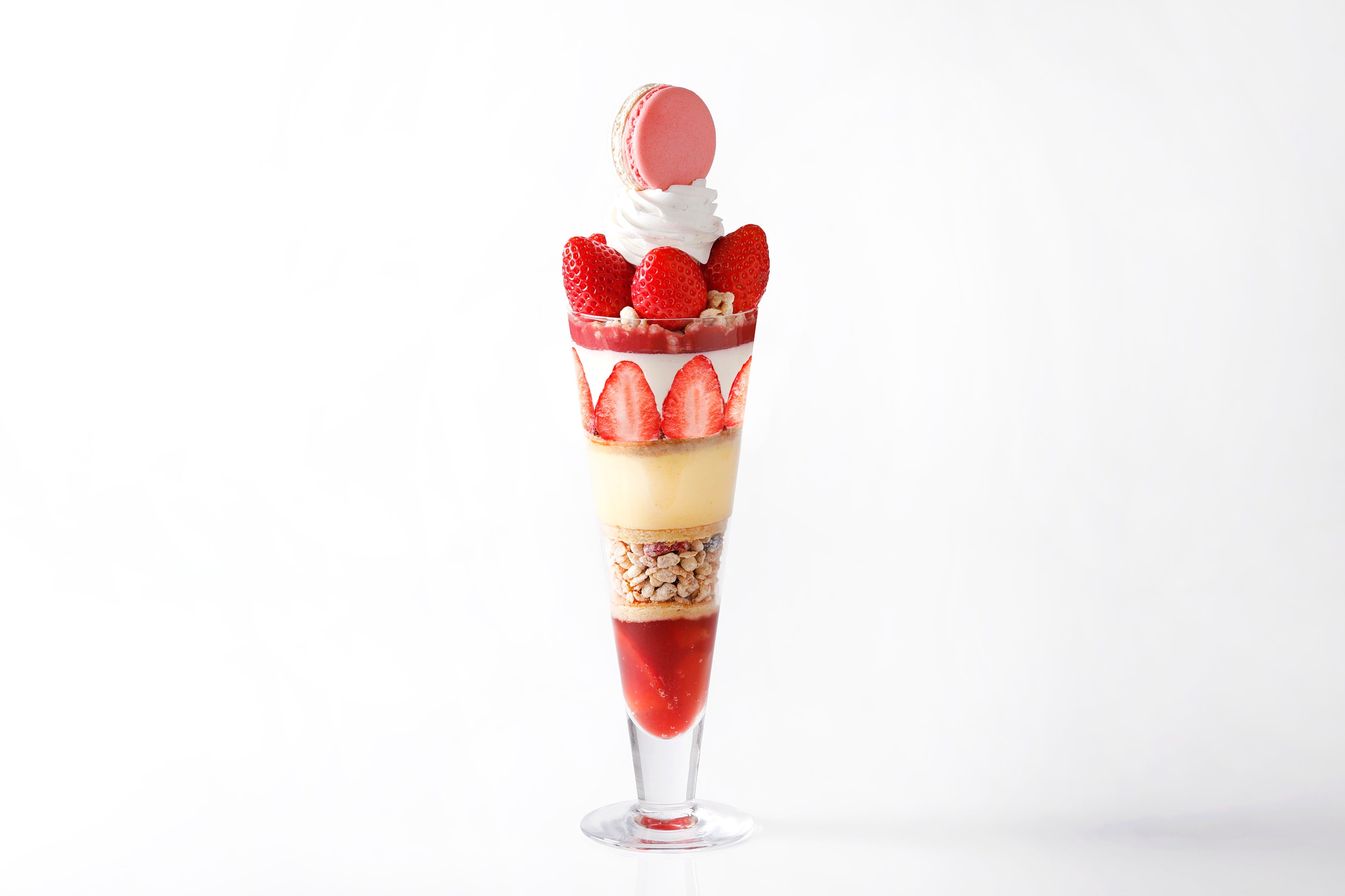 パフェグラスの底からトップまで13層からなる『あまおうパフェ』は、フレッシュないちご、ジュレやソース、マカロンなど、さまざなスタイルであまおうをご堪能いただけます。滑らかなマスカルポーネクリームや、グラノラなど「層」ごとに異なる食感もお愉しみください。