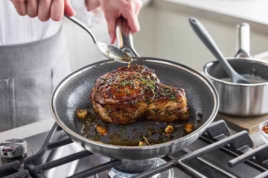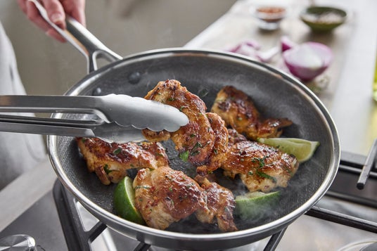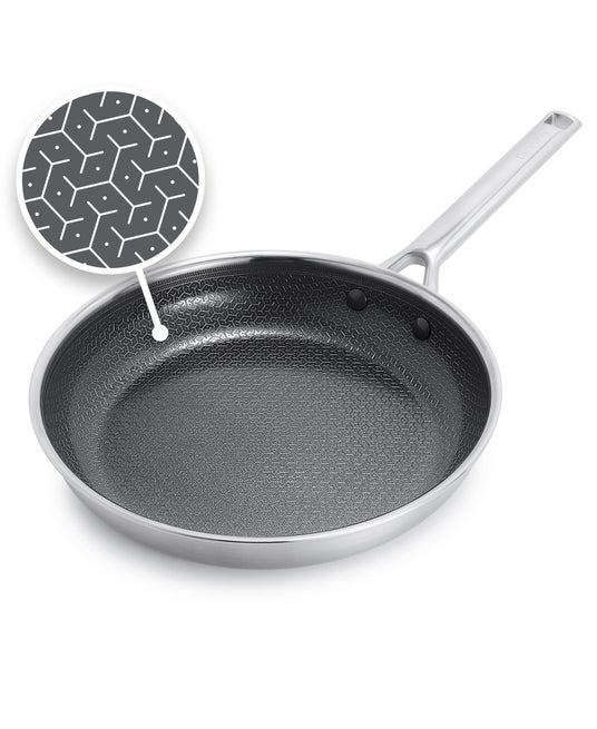 APEXの最大の特徴は、耐久性の高いステンレスベースに強力なエッチング(凹凸)加工を施し、PFASフリーのセラミック層を融合させた独自構造です。 表面のステンレス(凸部)が食材にしっかりとした香ばしい「焼き色」をつけ、セラミック層で守られたエッチングの凸部分が摩耗を防ぎ、その「強さ」とこびりつき防止効果を持続させます。